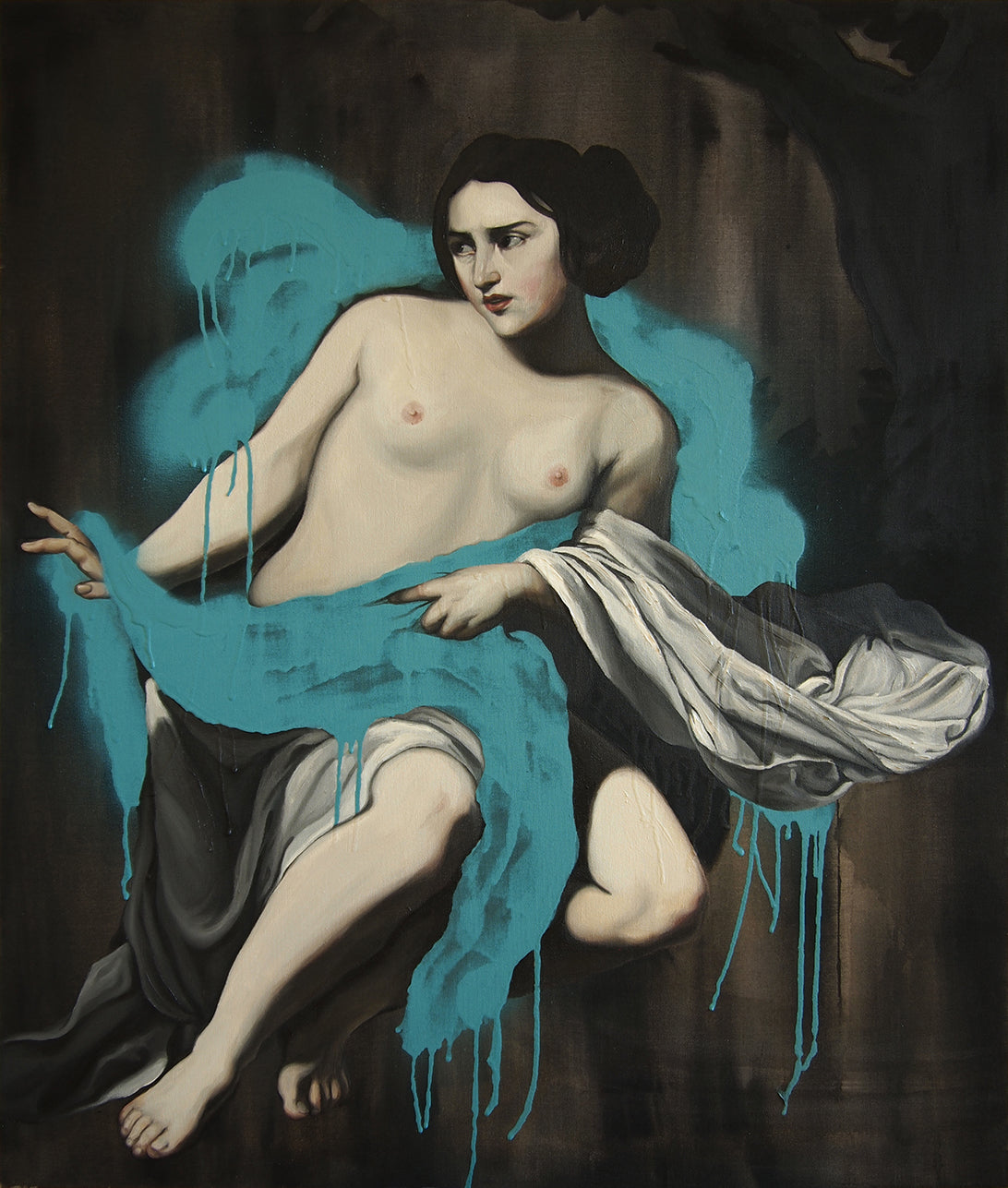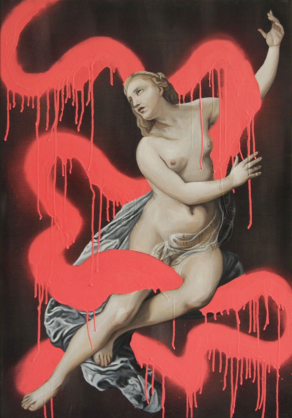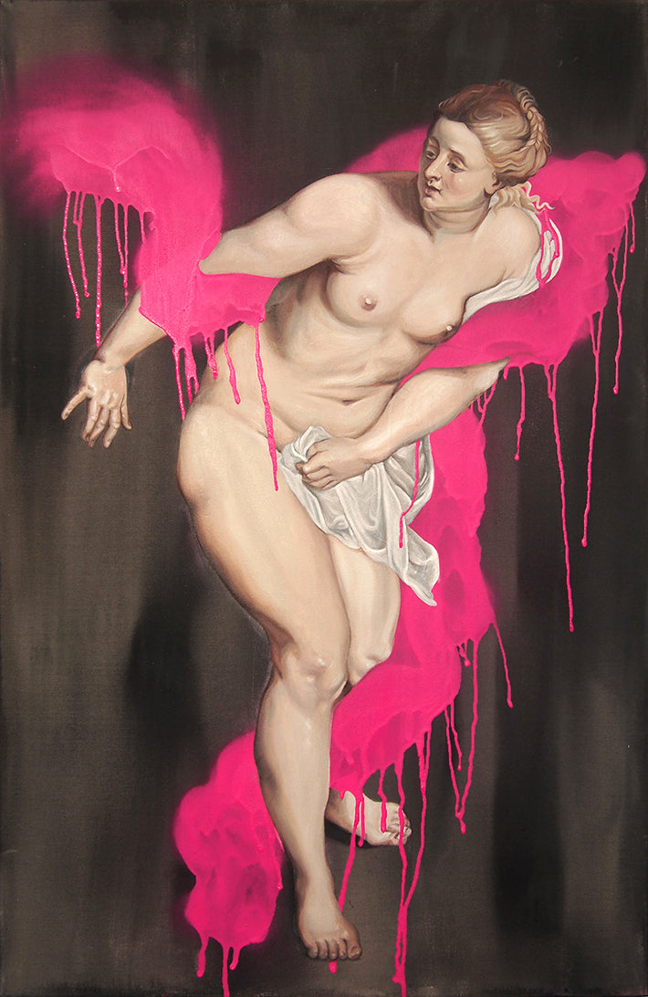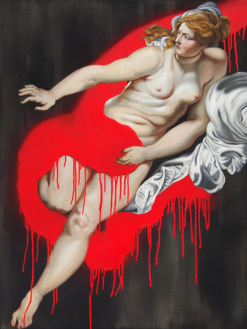 Taken (2016-2018) is a series of spray paint and acrylic paintings addressing historical depictions of violence against women. In the series, I take historical paintings depicting violence against women and remove and isolate the women from the violent context. I started this series because a lot of biblical stories, myths and legends that paintings used to be based on, where very heavy on violence against women, and in the paintings themselves, the women are more often than not painted by men and highly sexualized... the whole trend disturbed me. The series focused on subjects such as Susanna and the Elders, Syrinx and Pan and Cleopatra’s suicide.