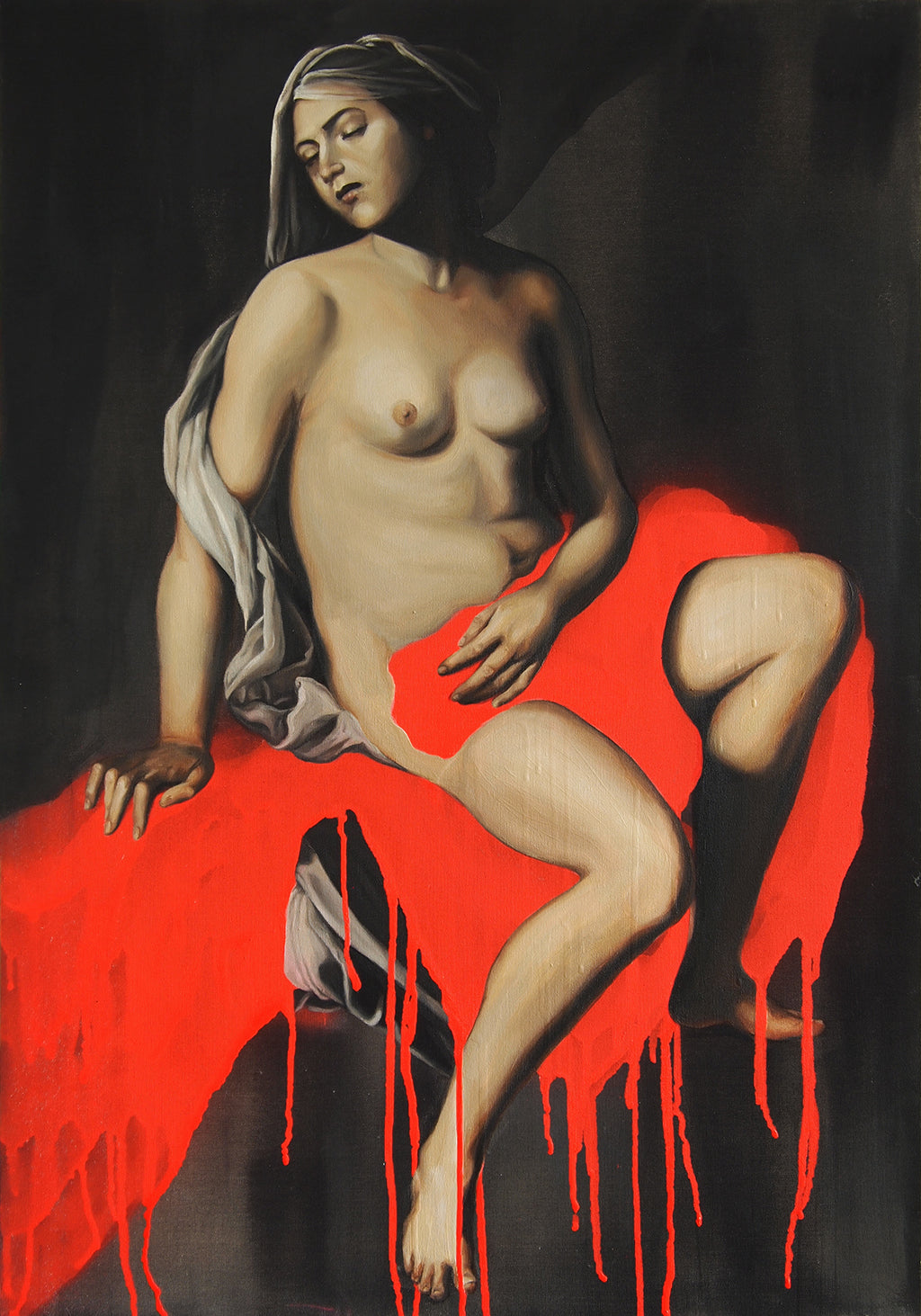 I was hesitant to include Cleopatra in this series, as before this point the series focuses more on men's infliction of violence towards women. Cleopatra's story is a suicide. I included Cleopatra in the series because of the way her suicide is always depicted. Male artists all too often used the story of Cleopatra as an excuse to paint a sexy woman writhing in bed, exposing her breasts, whilst a snake or two bites them. I find the sexualizing of a woman taking her life to be extremely distasteful, and knew I had to include her in the series. This painting, based after Massimo Stanzione's Cleopatra, is one of the less absurd depictions of the event, but focuses more on Cleopatra's body and sensual expression than it does the snake that was biting her. Taking her out of the context of her suicide, we can appreciate Cleopatra as a sensual beauty all her own, without the overtones of suicide, violence and death tagged on as an excuse to paint a nude woman.
