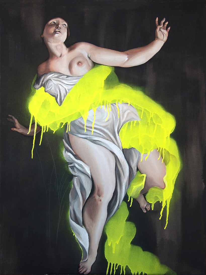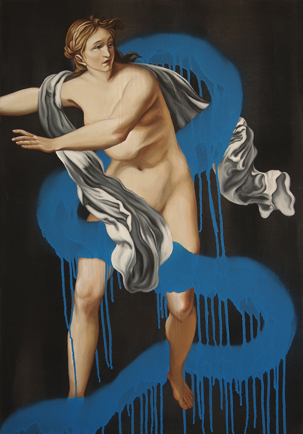 Syrinx was the first in the Taken series, and really started it all. In Classical Mythology, Syrinx was a nymph known for her chastity. In the story of Syrinx and Pan, she is pursued by the greek god Pan as he tries to force himself on her. Desperate, Syrinx runs to the river's edge and pleads for help. In response, she is transformed into water reeds, which Pan proceeds to harvest and fashion into a set of pan pipes. The frustrating end to this story aside, the paintings of the subject range drastically. The painting this is based off of Pan and Syrinx by Ludovico Dorigny, has very dark overtones, Pan depicted almost demonically, reaching from the shadows to grab Syrinx as she runs. Before Taken evolved into the series that is is today, it started as this painting and a desire to do a large study of drapery, but once I learned more about the painting I knew I had to make it something more. I took Pan out of the image, conflicted by the beauty of the painting, and attempted rape that it depicted. I was pleasantly surprised that when Pan was removed from image, Syrinx almost look like she was floating or falling. I loved the difference it made in the image.