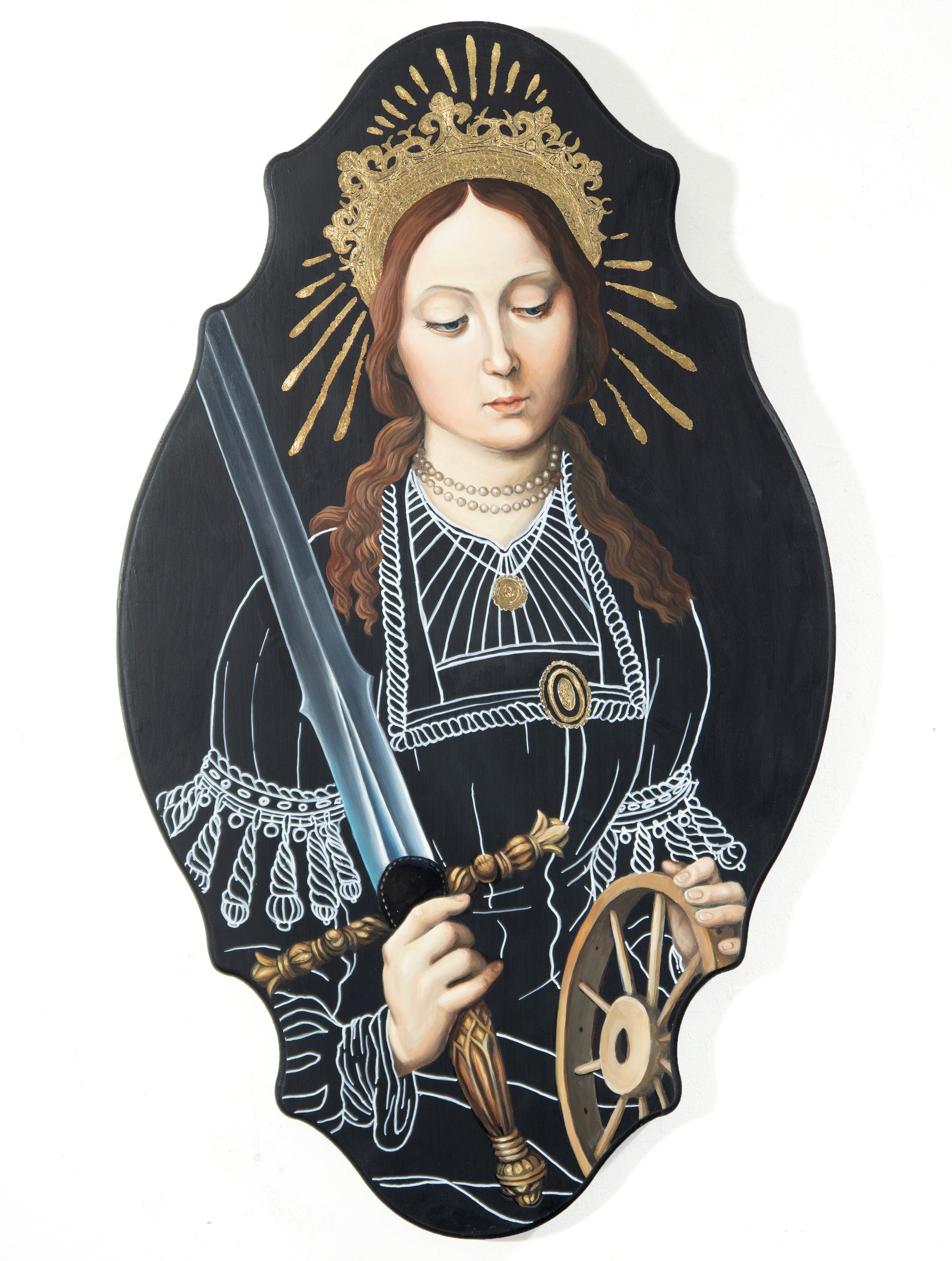 Acrylic, paint marker and gold leaf on wood panel. Ready to hang with brass d-ring on the reverse. Signed on the reverse.