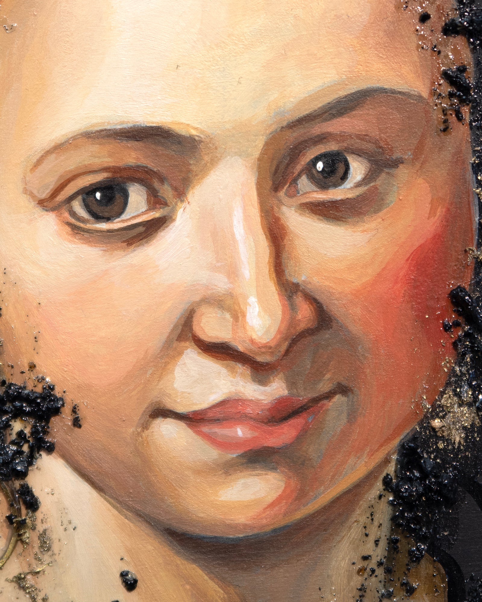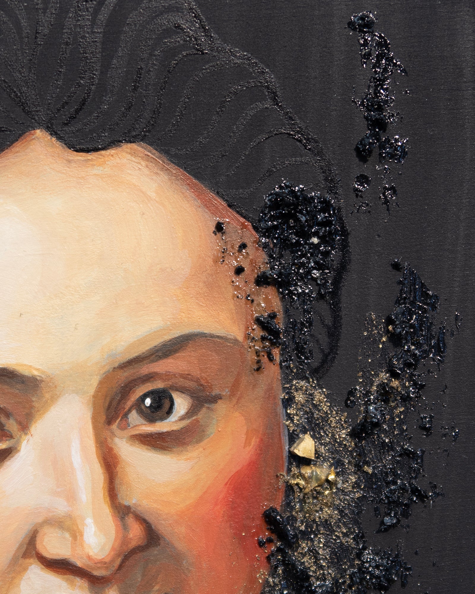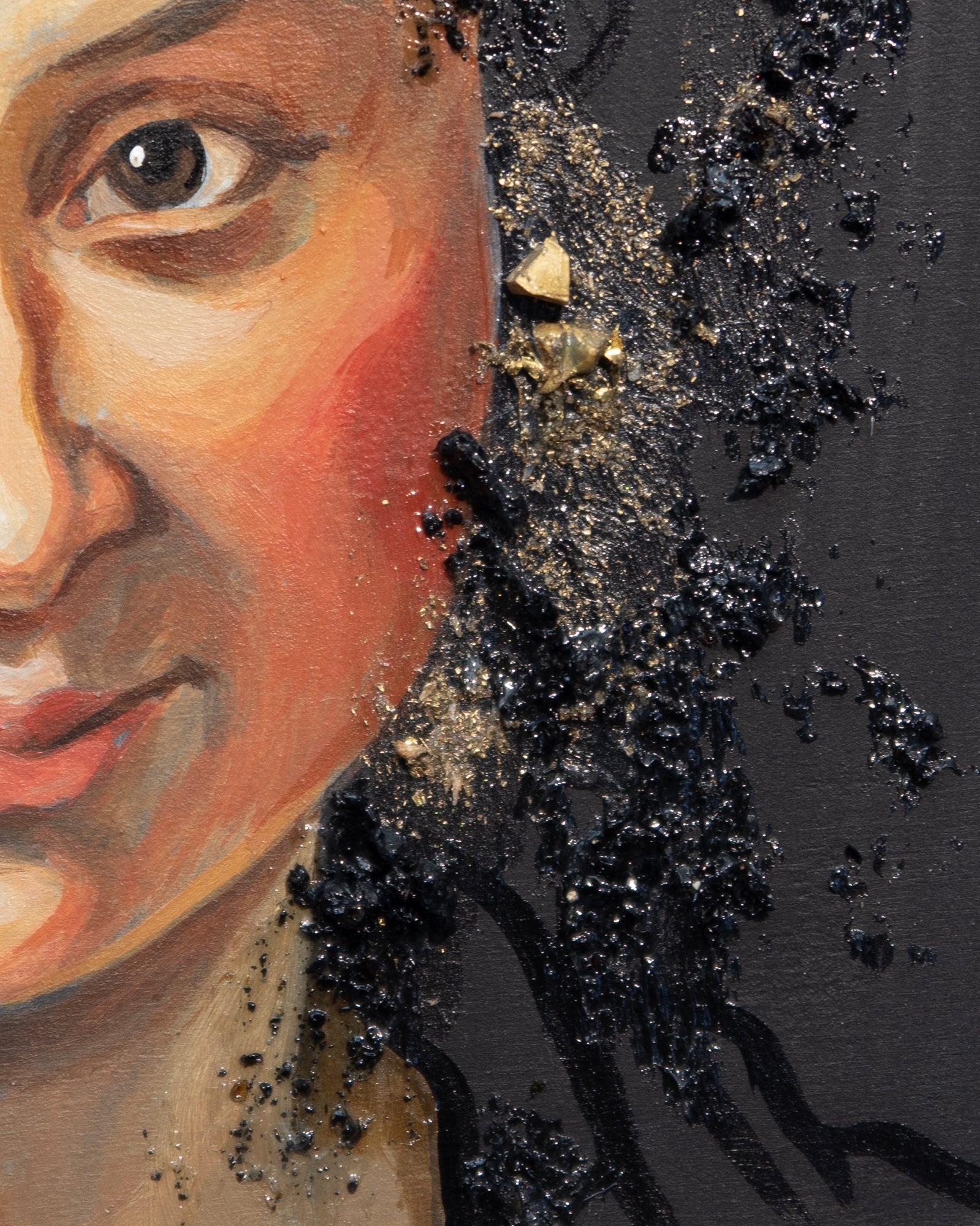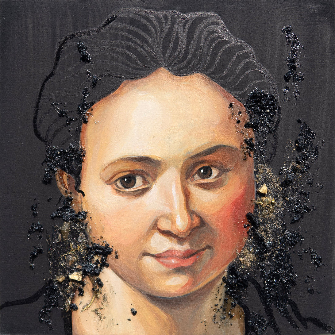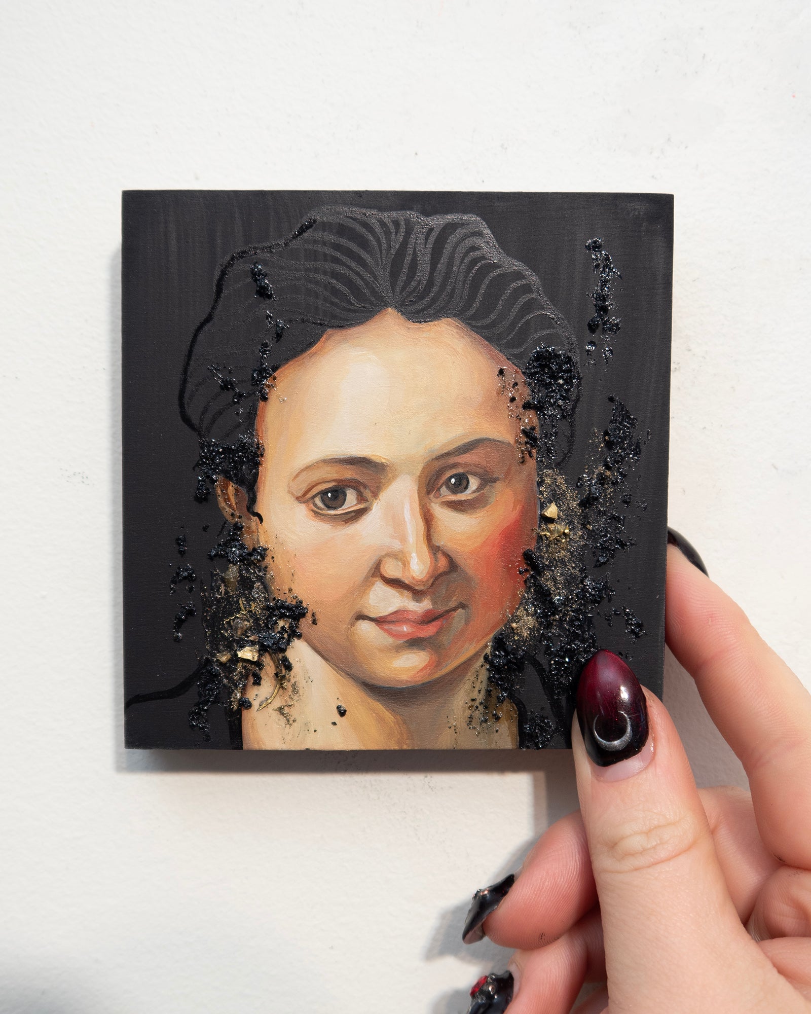 Acrylic, reharvested texture mediums on miniature cradled wood panel. Ready to hang. Signed on the reverse.