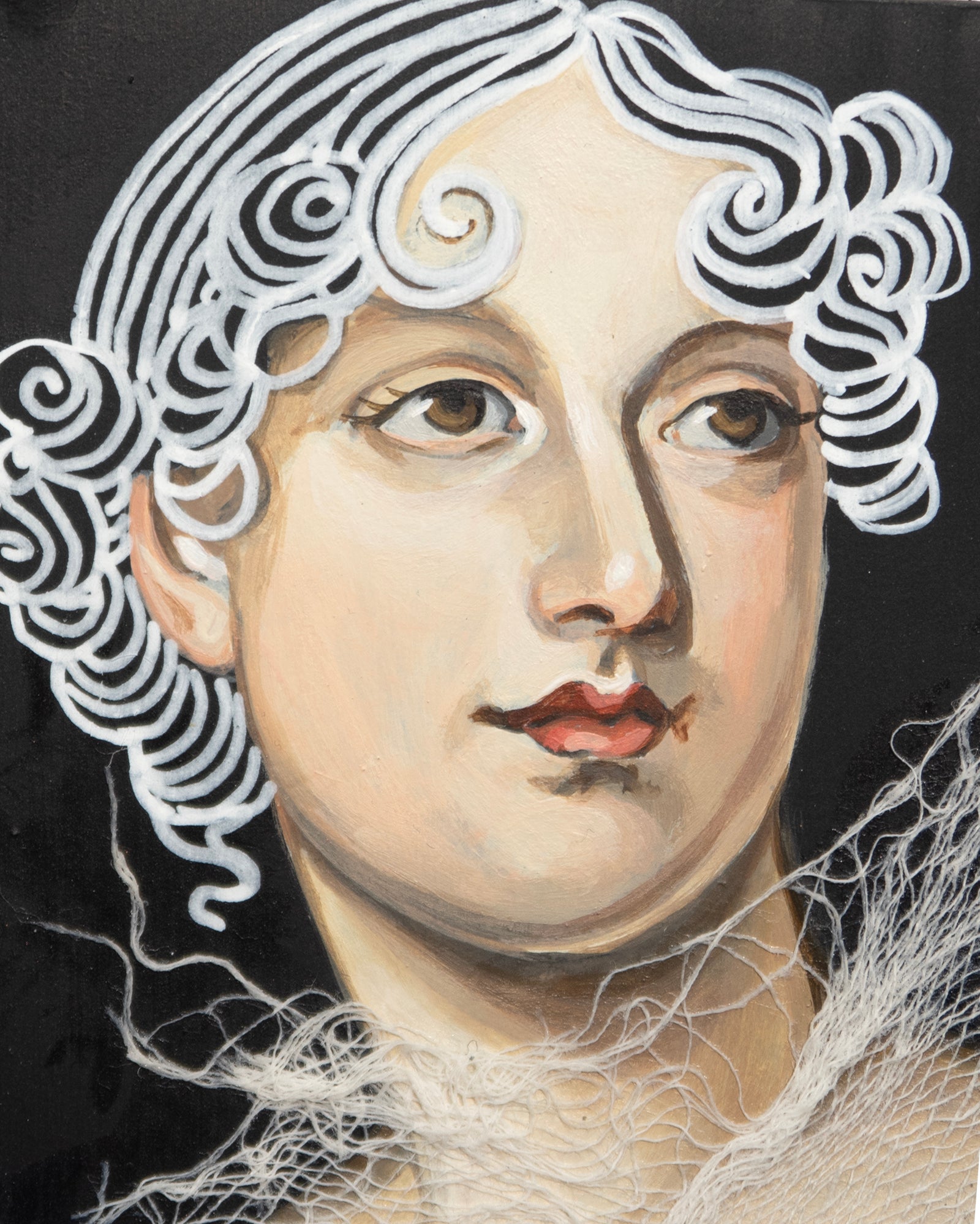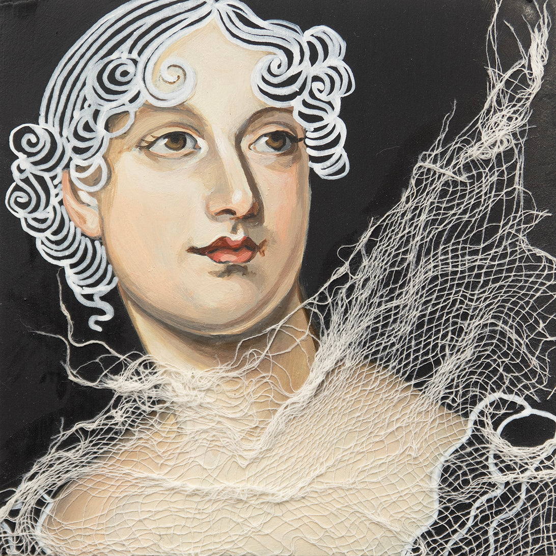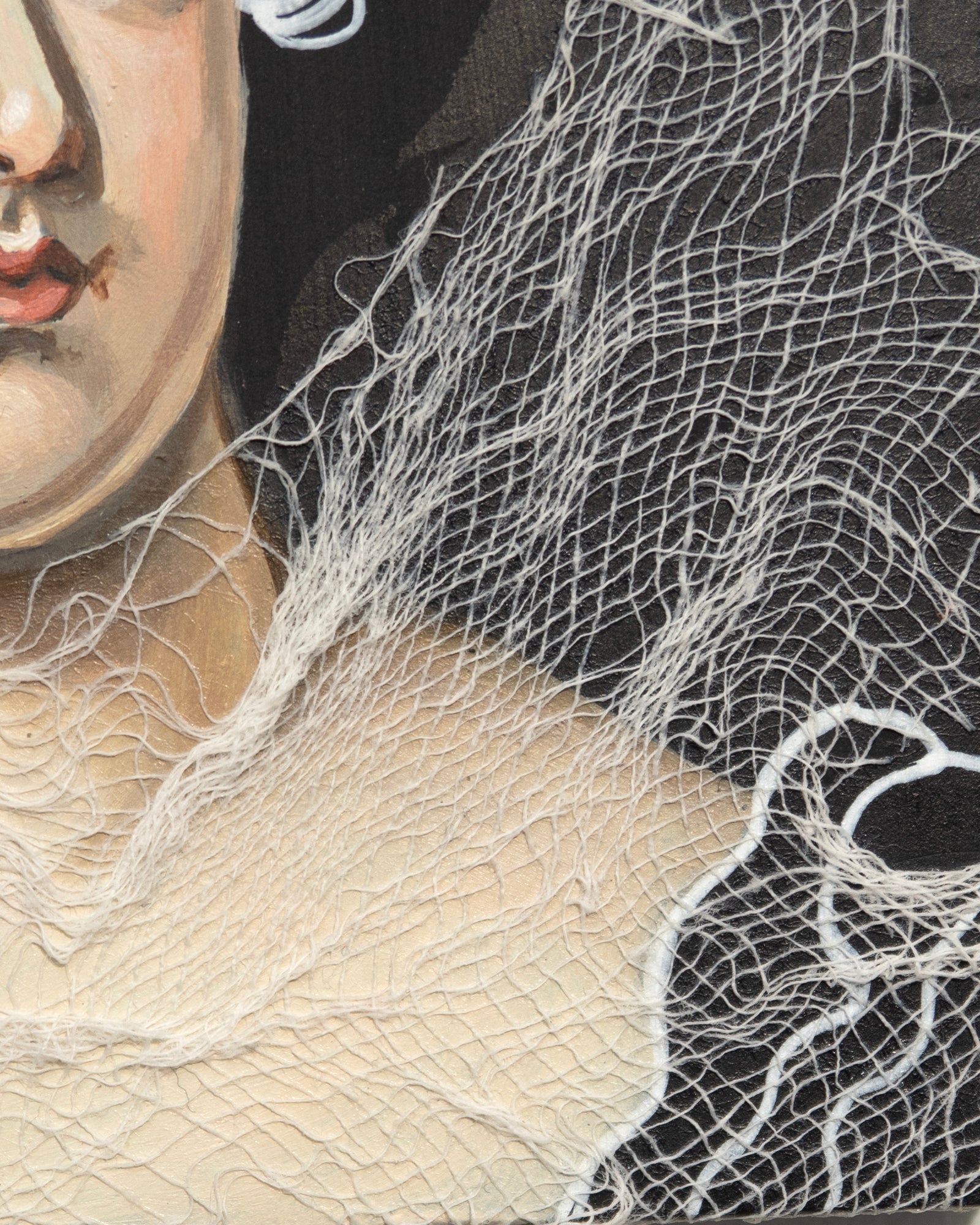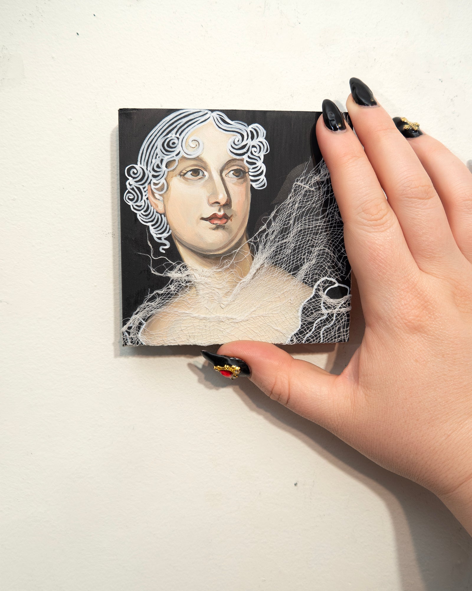 Acrylic, paint marker and cheesecloth on miniature cradled wood panel. Ready to hang. Signed on the reverse.