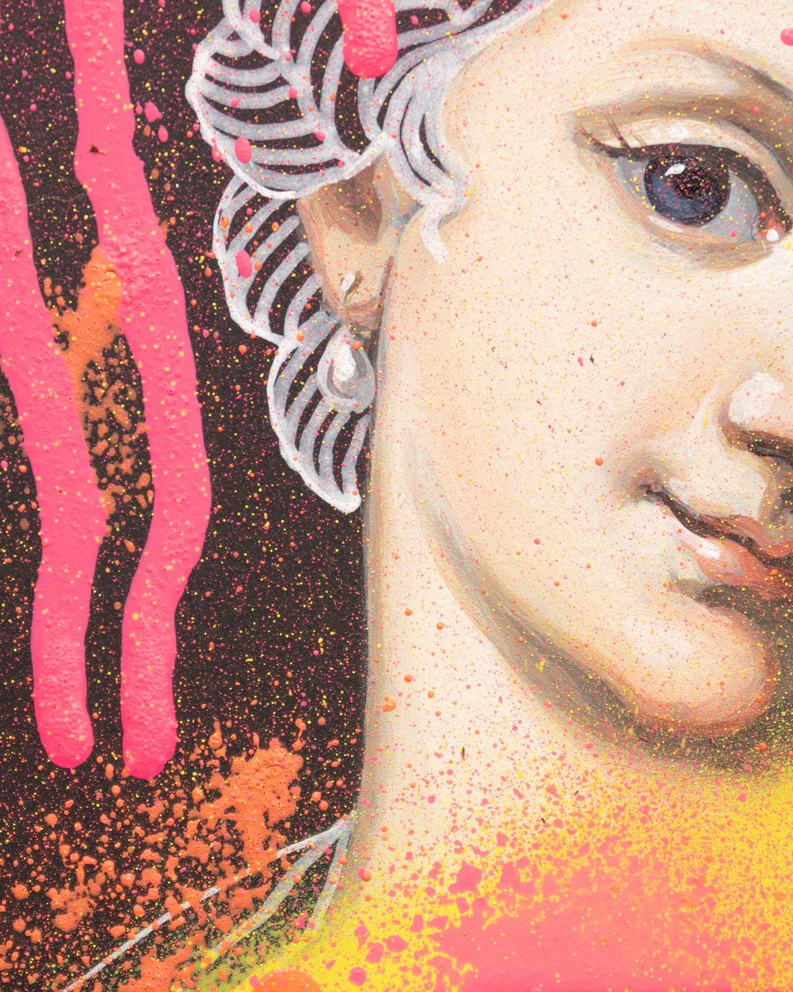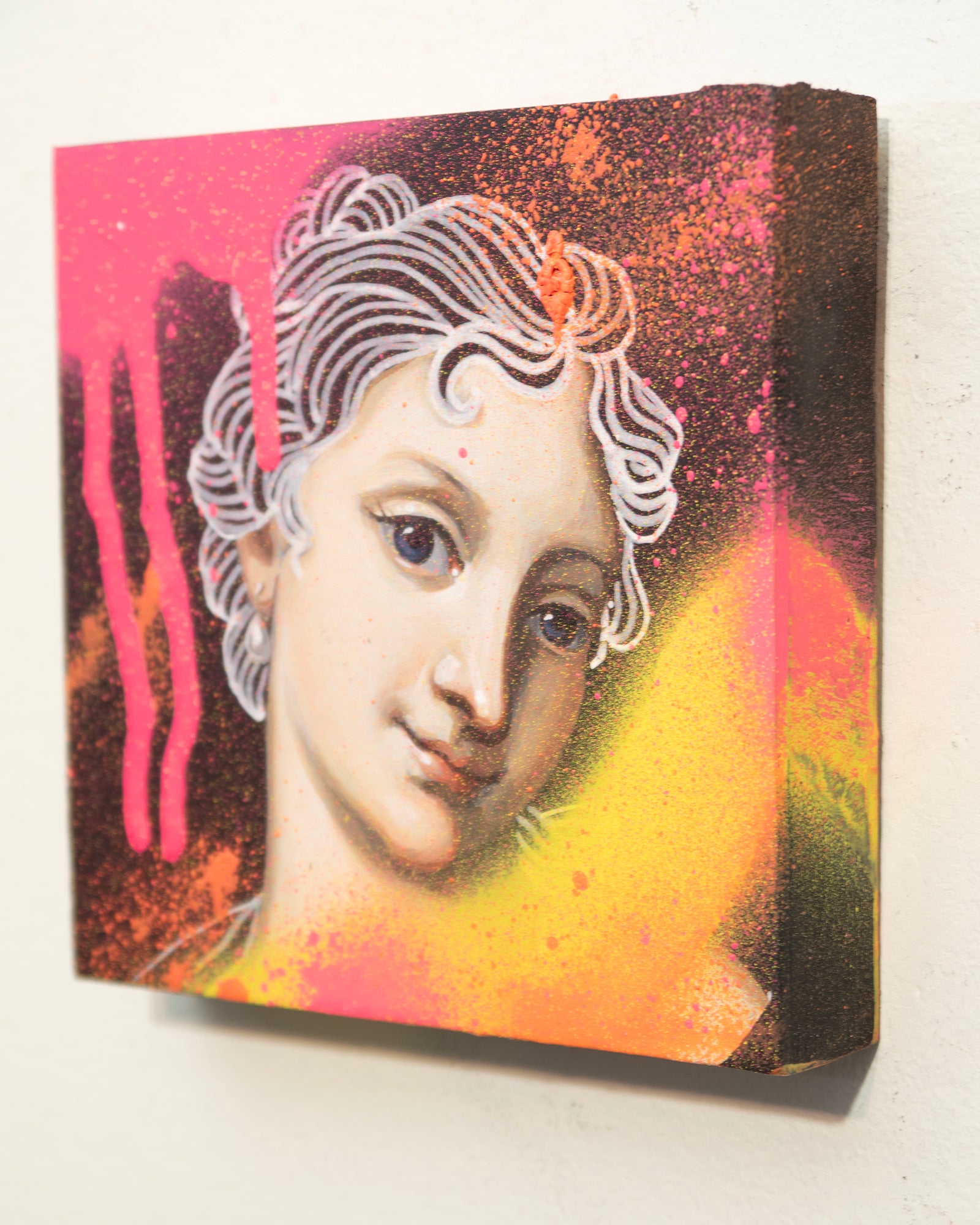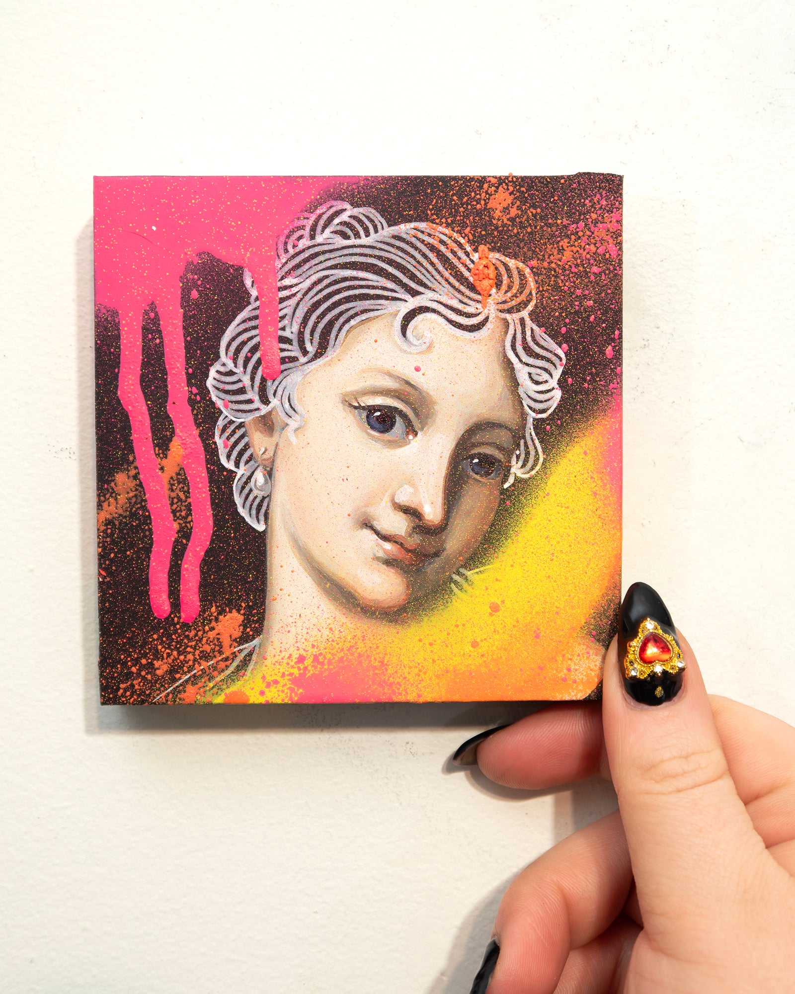 Acrylic, paint marker and spray paint on miniature cradled wood panel. Ready to hang. Signed on the reverse.