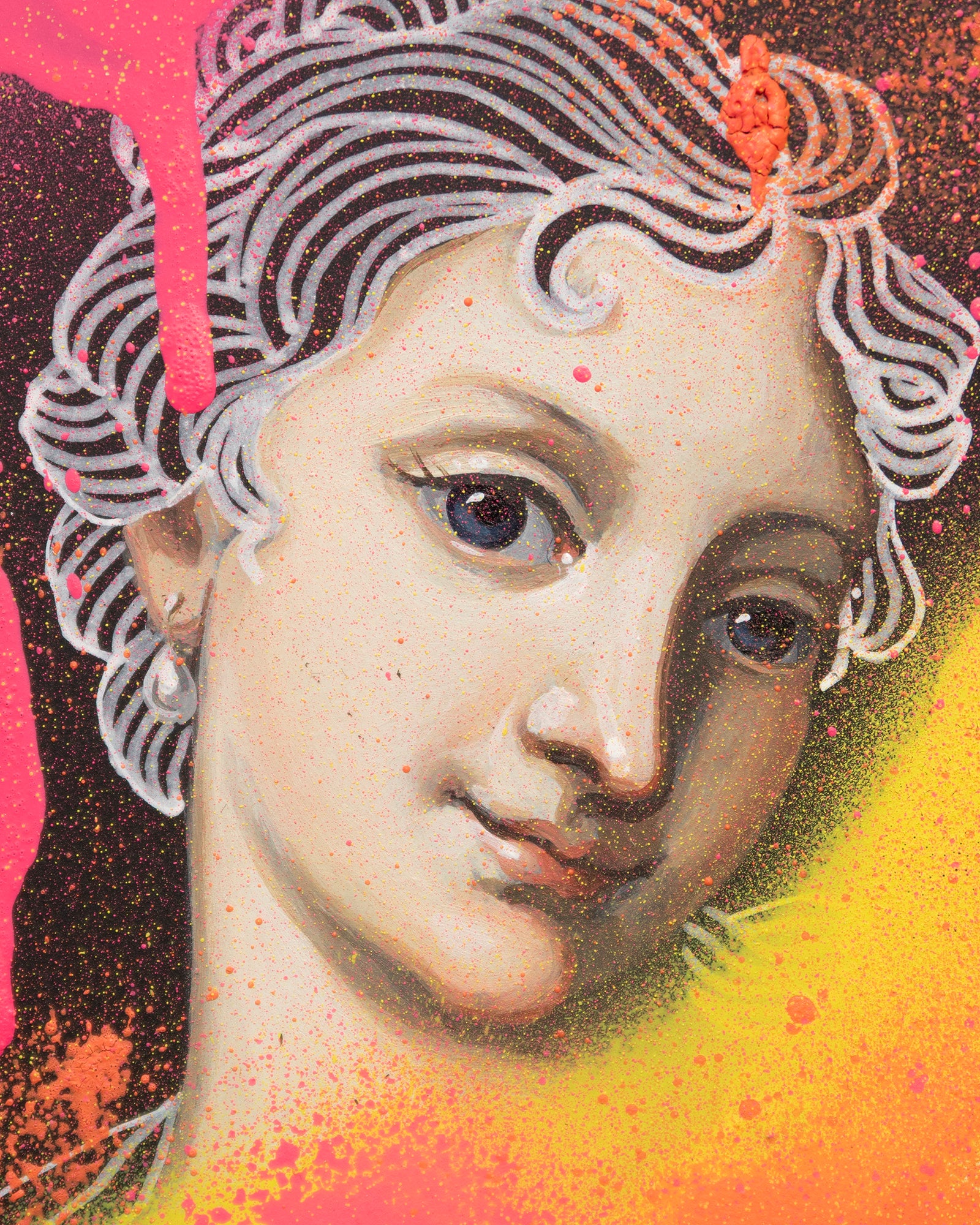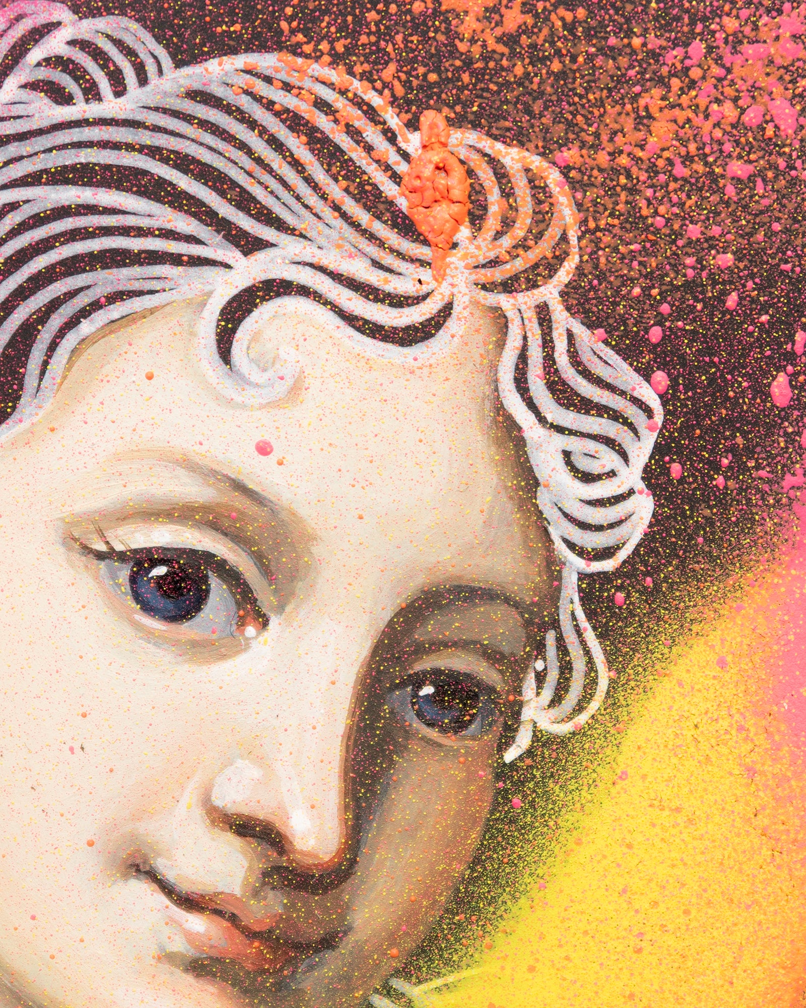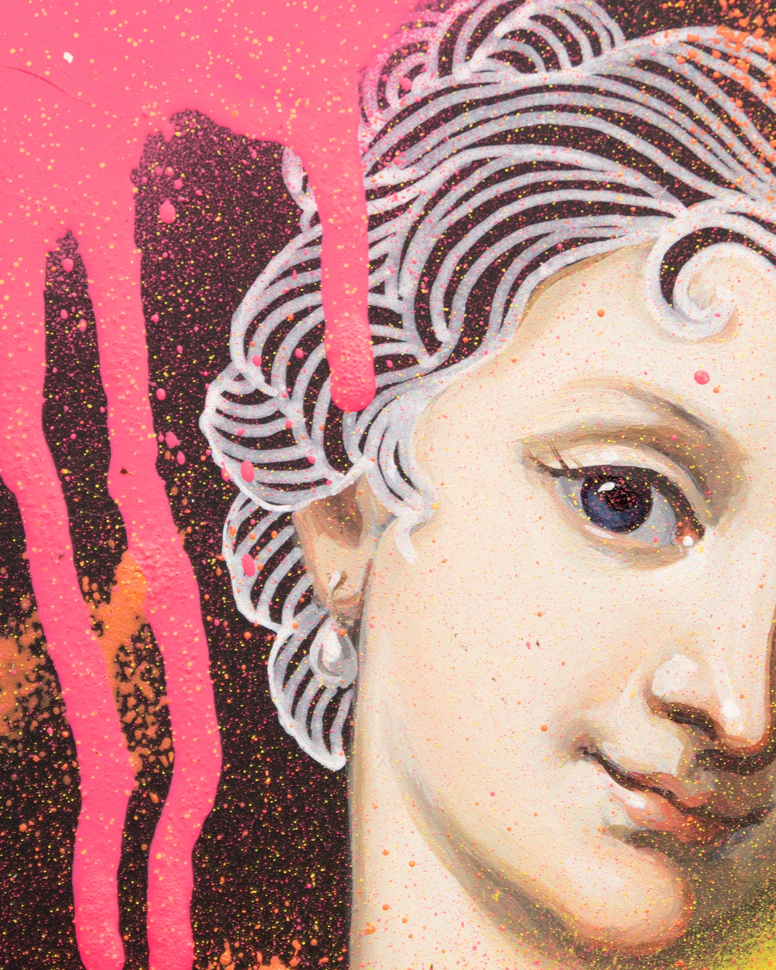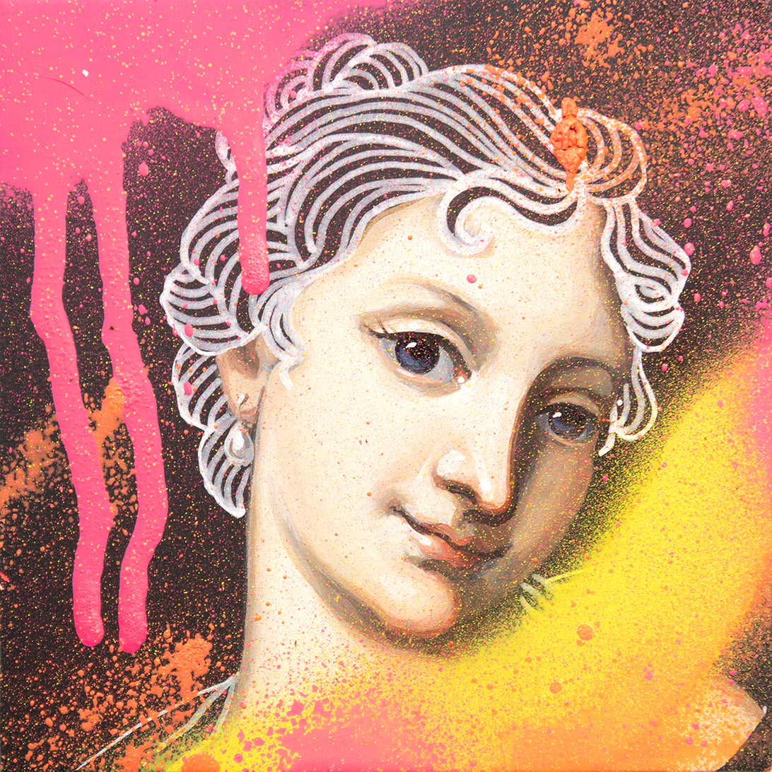 Acrylic, paint marker and spray paint on miniature cradled wood panel. Ready to hang. Signed on the reverse.